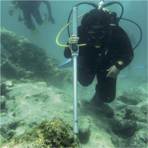 Magnetic anomaly locator for diver use. The locator indicates magnetic contrasts resulting from ferrous objects. The detection signals are transmitted to the diver by a single sided headset. The signal strength and field polarities are transmitted by an audio sig- nal coding. This locator is by now a standard tool in underwater munitions clearance.