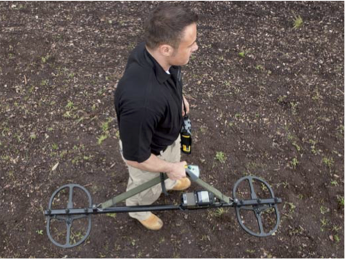 New metal detector designed upon the latest EBINGER Transmitter Receiver Exploration-technique. The loca- tor detects ferrous and non-ferrous metal. It differenti- ates between surface bound scrap metal and deep buried metal objects of substantial size. Small frag- ments are generally suppressed from indication, even when close to the sensor. The locator shows detection results by audio signal and by a galvanometer with positive and negative range. In digital surveys the cha- racter of the detected signatures is processed by the EPAS® software and will be converted into a colour coded map. These features and the high resolution bet- ween fragments and large munitions save time and expense for the removal of scrap metal in high metal impact areas.